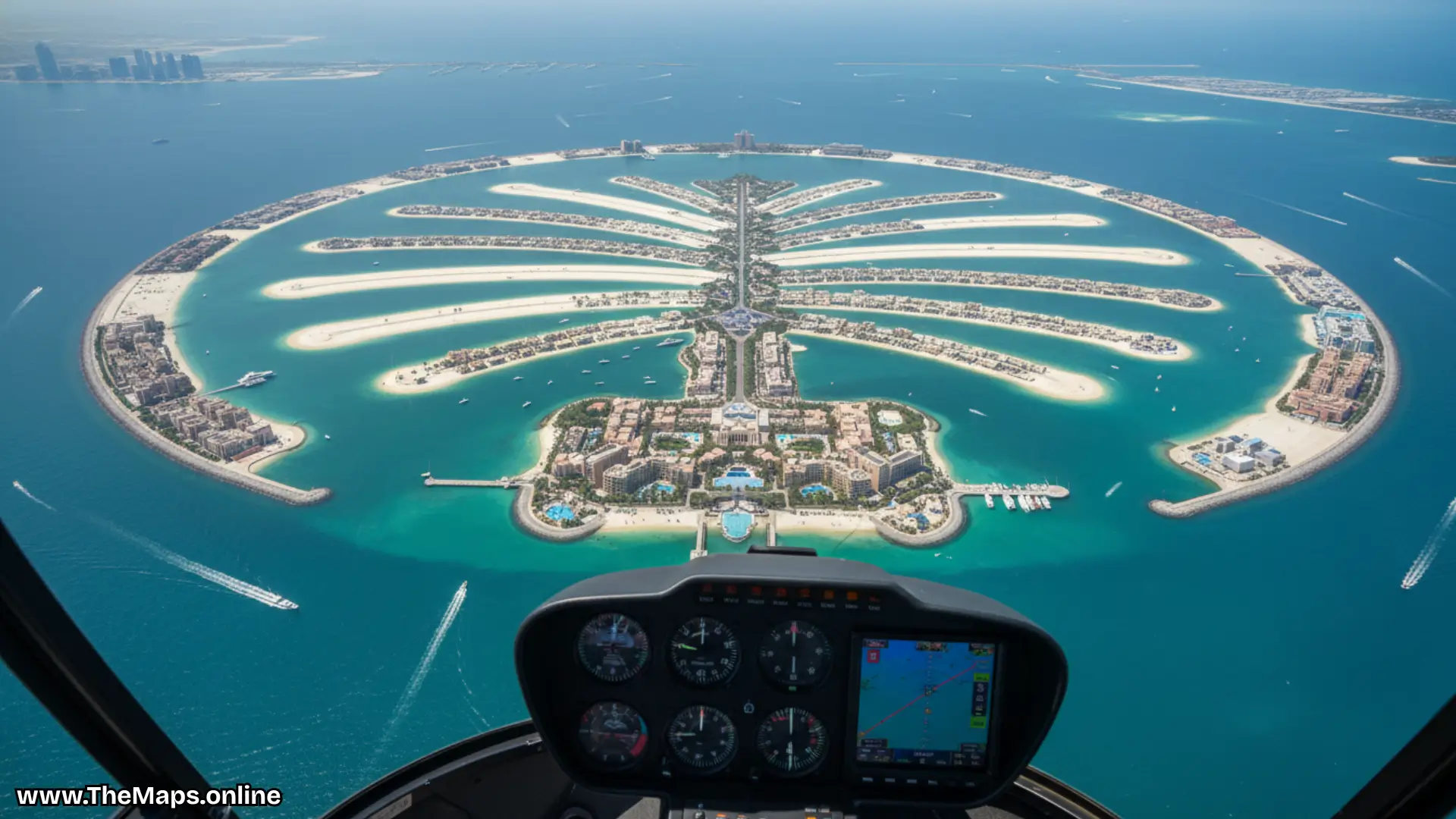 First, see the Palm from above. It looks like a tree. Only birds see this. So, fly high. Next, go to the helipad. The pilot greets you. You buckle up.